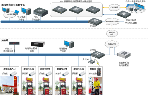 加油站车牌识别及客户服务系统由站端系统(部署在加油站)、传输网络和中心系统(部署在地市销售公司监控中心)这三个相互衔接、缺一不可的部分组成。